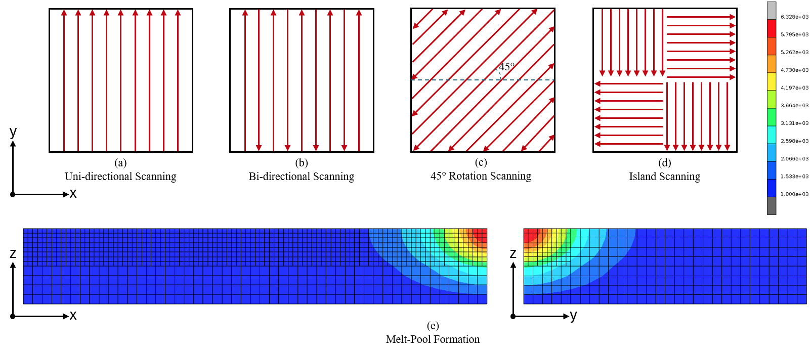 Figure 1: Different Scan Strategies and melt-pool formation in Additive Manufacturing