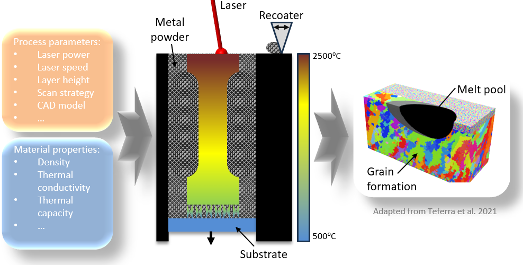 To better understand and precisely optimize the scan parameters in Laser Powder Bed Fusion, a part-scale thermal model of the printing process is essential. This model will take printing parameters and the physical properties of the materials as inputs and output the thermal field distribution throughout the part during fabrication. The resulting thermal data will be used by a PhD student to simulate crystal growth in the metal surrounding the melt pool, enabling deeper insights into microstructural evolution and material performance.