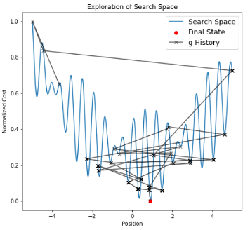 Figure 1. Left: Visualization of the adapted Simulated Annealing learning strategy, where two networks try to present a possible solution and the worst solution is randomly updated to generate another proposed solution in the next round. Right: xploration of Search Space: The plot shows the exploration of the search space by the simulated annealing algorithm. The normalized cost function is plotted against the position, with the final state marked in red and the history of g values marked in black.