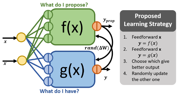 One of the learning algorithms that we want to focus on is Simulated Annealing (SA). Simulated Annealing compares an alternative state to its current state and if the state is better, accept the alternative and its alternative state. The benefit of this algorithm is that it does not require knowledge of the weight values. The network can be observed as a black box. We’ve adapted the classic SA system to consist of two networks that duel to present the best solution, where the losing network is randomly update to improve its suggestion, as shown in Figure 1 left. In a previous BEP project we have shown that our adapted SA algorithm is able to find the global solution, as shown in Figure 1 right. Within this project we want to continue and realize the algorithm in hardware, where the system can autonomously adapt its behavior to achieve its goal.